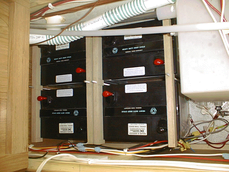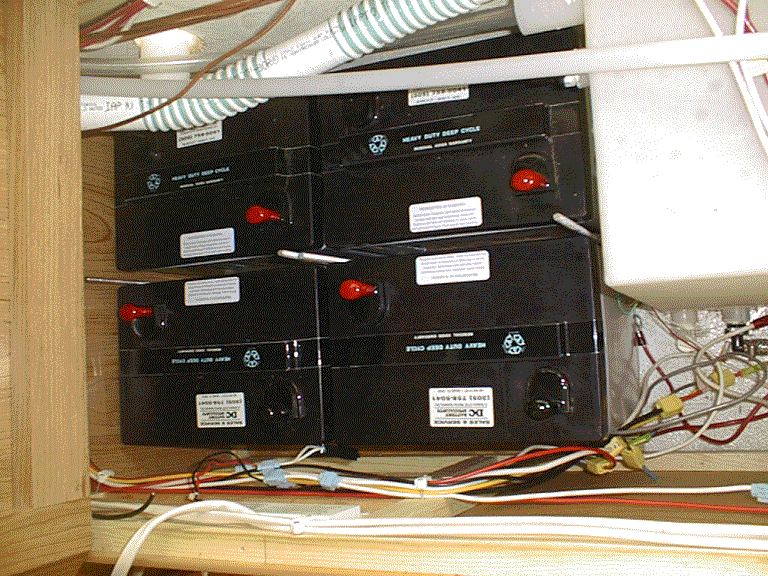 The batteries are cannected as 2 parallel pairs of series connected batteries. Each battery is 220 AH, 6Volts. A pair in series gives you a 220 AH 12 Volt bank. The 2 banks in parallel gives you a 440 AH 12 Volt bank.
