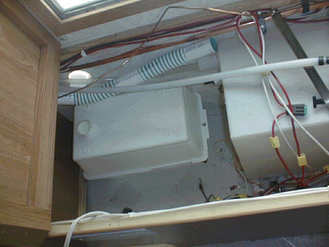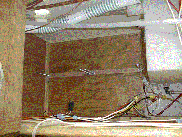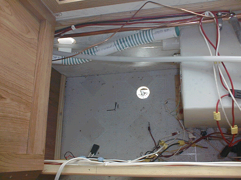 The camper has a pretty good sized area under the step up to the bedroom. It holds a 16 gallon fresh water tank and water pump. Before the installation of the 440 AH battery bank, it also held a group 29 battery and vented box as well as the converter which was mounted in the wall between the step/seat area and the inside of the camper.