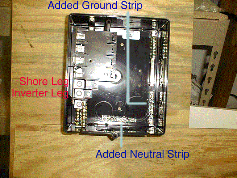 I bought a GE 220V breaker box and modified it to provided split dual 110V circuits. I did this by adding a second neutral and ground bar. The box accepts 4 full width breakers or 8 1/2 width breakers. I used the half widths. One of the 110V legs distributes the 110V shore power. The other distributes the inverter 110V output. The inverter has an automatic transfer switch that automaticaly switches the outlets it feeds to shore power when it is there. The breaker box mounts under the kitchen cabinet under the cooktop. On the shore power side, I have separate breakers for the inverter, air conditioner, and water heater. On the inverter side of the box I have a breaker for the microwave and one for all other 110V outlets. I have 1 shore power and 2 inverter breakers left as spares.