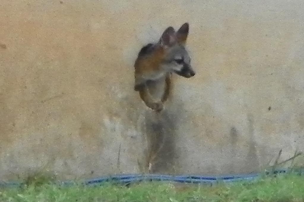 Mama Fox with her three kits outside their drainpipe den, on neighbors' property
